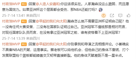 对此,付政浩的回复是:“小崔受伤跟国家队有一毛钱关系?小崔是不具备NBA天赋却强行要打,受伤是大概率事件,只是没想到伤得这么快罢了。他和杨瀚森是完全不同的两种情况。至于杨瀚森已经很久没打正规比赛了,正好借亚洲杯检验一下成果。杨瀚森本人有为国效力的意愿,国家队也需要他,开拓者也支持,何乐而不为?”