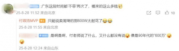 有网友评论“广东这段时间都’不菲’两次了,哪来的这么多钱”,媒体人付政浩打趣回复:“只能说卖周琦的那600W太耐花了。”