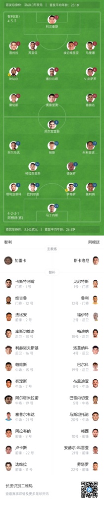 智利首发:23-科尔泰斯、3-马里潘、4-塞拉尔塔、5-洛约拉、6-维特森-皮萨罗、8-比达尔、10-桑切斯、14-奥索里奥、17-苏亚佐、18-埃切维里亚、20-卢卡斯-塞佩达
