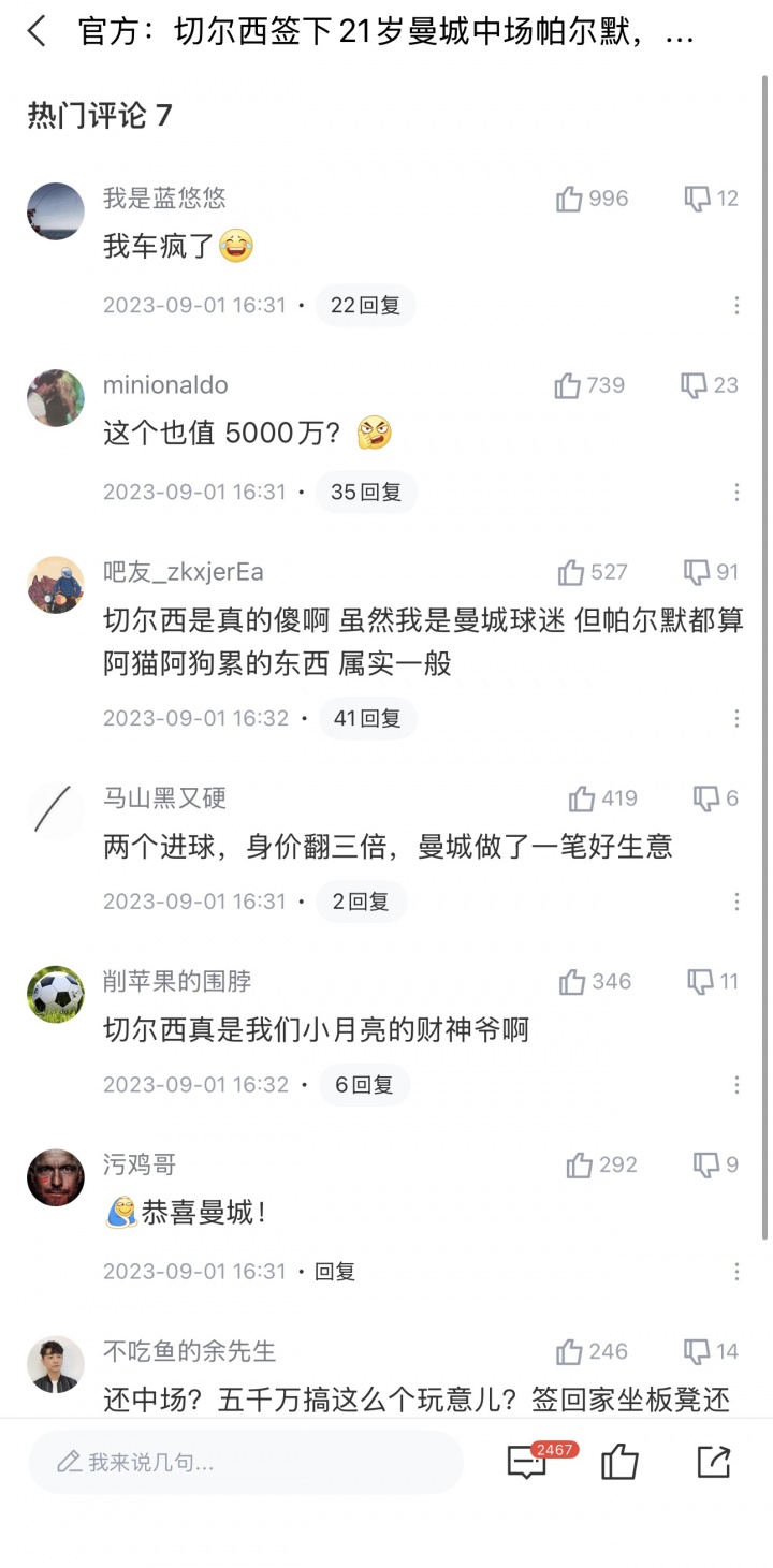 2023年9月1日,切尔西从曼城签下帕尔默,据多家媒体报道切尔西支付的转会费为4000万英镑+250万英镑浮动。目前德转显示转会费用为4700万欧元。当时评论区一片不解之声。