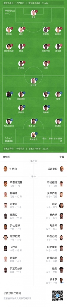 曼城客战摩纳哥首发:哈兰德、罗德里先发,福登、斯通斯出战