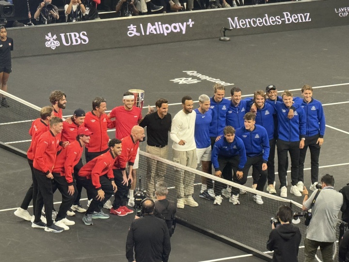 他与费德勒以及参赛选手们进行了合影,还抛硬币为比赛“开球”。