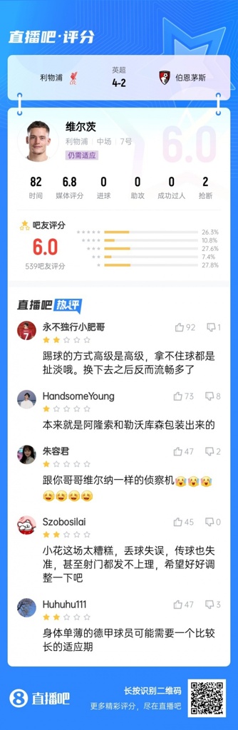 08月16日讯 利物浦迎来新赛季英超揭幕战,主场4-2击败伯恩茅斯,1.25亿欧新援维尔茨表现一般,媒体评分6.8,吧友评分6分。
